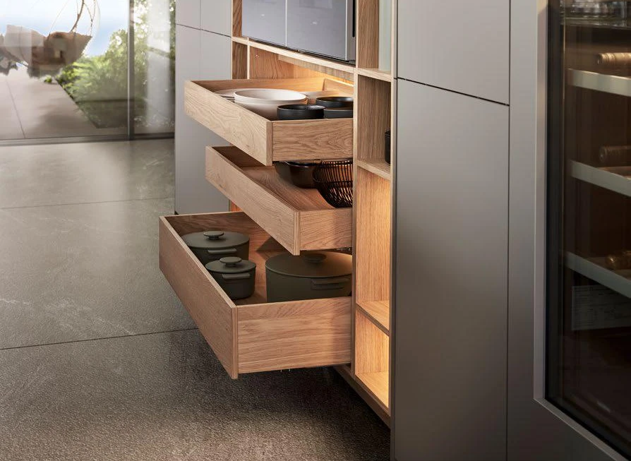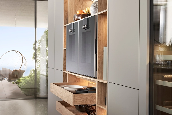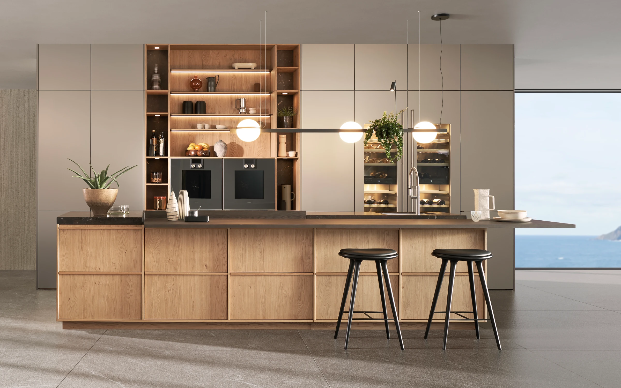 A Japandi-inspired kitchen with light wood and glossy finishes. Soft tones, clean lines, and Nordic calmness.